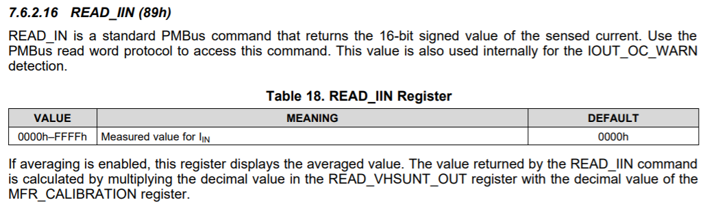 2.Use the equation in data sheet to calculate the MFR_CALIBRATION value=0.00512/(Current_LSB*Rshunt)=0.00512/(1mA/bit*0.5mΩ)=10240(Decimal)/2800(Hex)