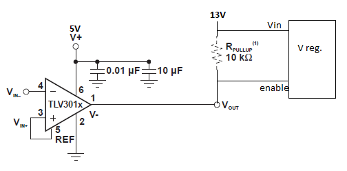 Our customer have tied the outpun pin of TLV3011-EP to a supply of 13V. His implementation is currently working, but will this eventually damage the device?