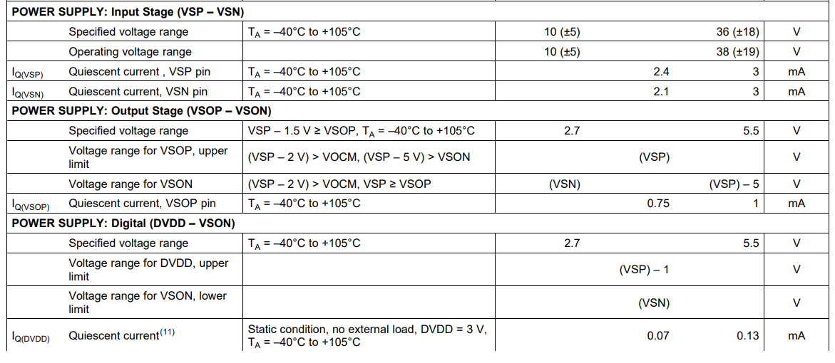 However, please notice that the positive (INP) and negative input (INN) absolute voltage must remain inside the allowed common-mode range, where the absolute input voltage at the INP1 and INN1 inputs must be at least 2.5V from the positive (VSP) and negative supply rail (VSN); or in other words, the absolute voltage input range has to be within (VSN)+2.5V and (VSP)-2.5V on both positive and negative inputs.