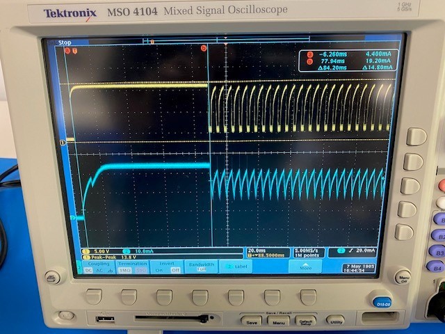Question: After enable is asserted, the circuit stays at 26 ma and never reduces down to 15mA after the Hold time (100ms). What is wrong? Since I am using 24 volts, do I need to modify the DRV110 Zener external resistor to 7.725Kohm as per the spreadsheet to make this work?
