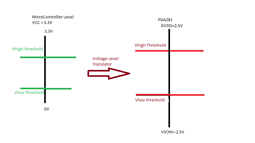 I want to use the PGA281. For VSOP = 2.5 V and VSON = -2.5V. When using a negative supply for VSON, the datasheets says "The negative digital supply is connected to the VSON pin. Take care if using split supplies on the VSOP and VSON pin because the logic low and high thresholds are determined by DVDD and VSON. In normal operation, VSON is connected to the system ground."