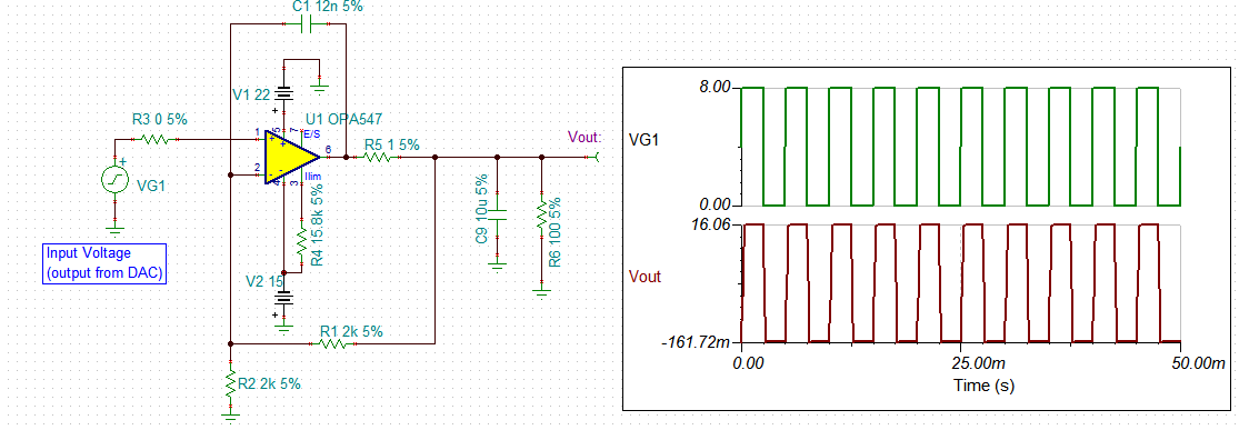 I am using OPA547 to generate a voltage source using a DAC. My DAC feeds a voltage to OPA547 which is currently used in non-inverting configuration. OPA547 multiplies it with a fixed gain and gives the output voltage.
