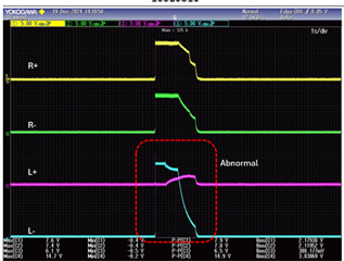 Similarly, when measuring each probe at the amplifier IC output (before the coil) and referencing it to the ground chassis, we observed the following waveform: