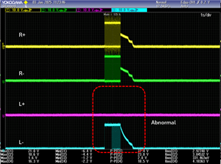 When measuring each probe at the speaker output and referencing it to the ground chassis, we observed the following waveform: