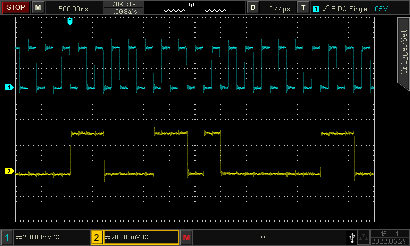 Conditions are: SCK 12.288 MHz, BCK 3.072 MHz (32 bit per channel), LRCK 48 kHz, sine wave of 24 kHz
