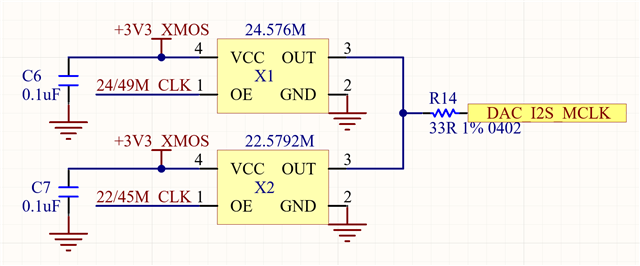 - External MCLK from 24.576M/22.5792M crystal, BCK, LRCK, DATA divided from the same crystal by XMOS USB IC