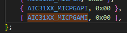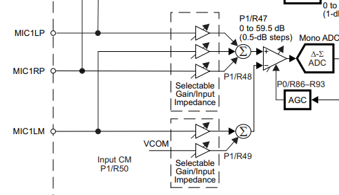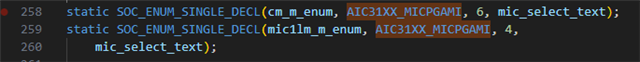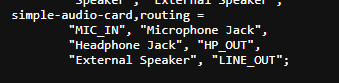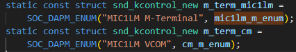 DEVICE-TREE: tlv320aic3110: audio-codec@18 { #sound-dai-cells = <0>; compatible = "ti,tlv320aic3110"; reg = <0x18>; HPVDD-supply = <®_vcc_3v3>; SPRVDD-supply = <®_vcc_3v3>; SPLVDD-supply = <®_vcc_3v3>; AVDD-supply = <®_vcc_3v3>; IOVDD-supply = <®_vcc_1v8>; DVDD-supply = <®_vcc_1v8>; reset-gpios = <&gpio4 31 GPIO_ACTIVE_LOW>; ai31xx-micbias-vg = <MICBIAS_2_5V>; }; . . . sound { compatible = "simple-audio-card"; simple-audio-card,name = "kirtan_sak"; simple-audio-card,format = "i2s"; simple-audio-card,bitclock-master = <&dailink_master>; simple-audio-card,frame-master = <&dailink_master>; dailink_master: simple-audio-card,cpu { sound-dai = <&sai1>; system-clock-direction-out; }; dailink_codec: simple-audio-card,codec { sound-dai = <&tlv320aic3110>; system-clock-frequency = <12000000>; }; }; . . . &sai1 { #sound-dai-cells = <0>; pinctrl-names = "default"; pinctrl-0 = <&pinctrl_sai1>; assigned-clocks = <&clk IMX8MP_CLK_SAI1>; assigned-clock-parents = <&clk IMX8MP_AUDIO_PLL1_OUT>; assigned-clock-rates = <12288000>; fsl,sai-mclk-direction-output; fsl,sai-synchronous-rx; status = "okay"; }; . . . pinctrl_sai1: sai1grp { fsl,pins = < MX8MP_IOMUXC_SAI1_TXFSAUDIOMIX_SAI1_TX_SYNC 0x94 MX8MP_IOMUXC_SAI1_TXCAUDIOMIX_SAI1_TX_BCLK 0x94 MX8MP_IOMUXC_SAI1_RXD0AUDIOMIX_SAI1_RX_DATA00 0x94 MX8MP_IOMUXC_SAI1_TXD0AUDIOMIX_SAI1_TX_DATA00 0x94 MX8MP_IOMUXC_SAI1_MCLK__AUDIOMIX_SAI1_MCLK 0x94 >; };