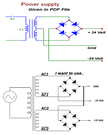 2Q. is it possible to use single primary & dual secondary (35V, 500VA per secondary coil) in Transformer instead of using 4 transformers 24V, 300VA for stereo? If yes what changes would be required?