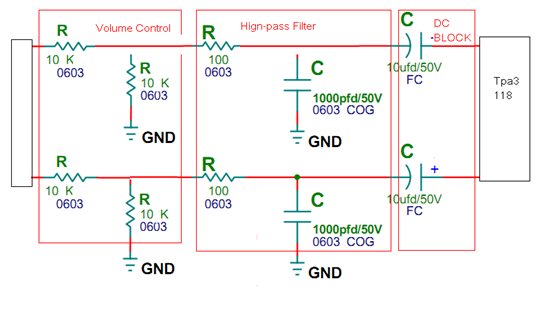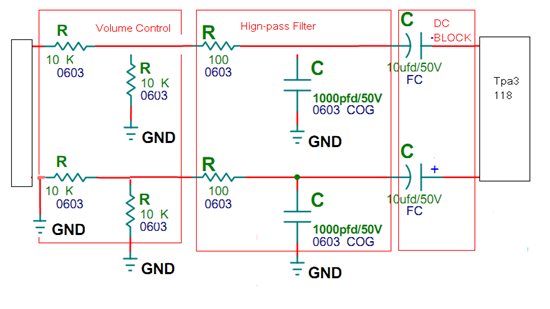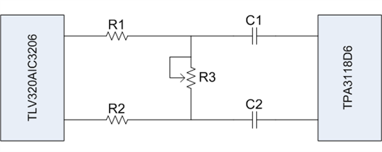 Attached is a small sketch of the proposed connection, my headache is to determine the values of the R1-R3 and C1-C2. I assume R1 and R2 are needed to protect the TLV against shortcircuit on "0 volume" setting. DC blocking caps should as far as I can tell also be required, although figure 13 of the TLV datasheet shows a similar application without them (?).