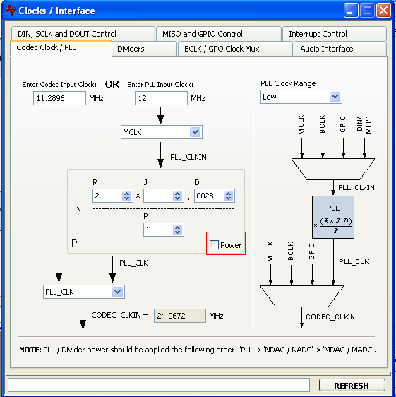 AIC3204_rset( 4, 3 ); // PLL setting: PLLCLK <- MCLK, CODEC_CLKIN <-PLL CLK