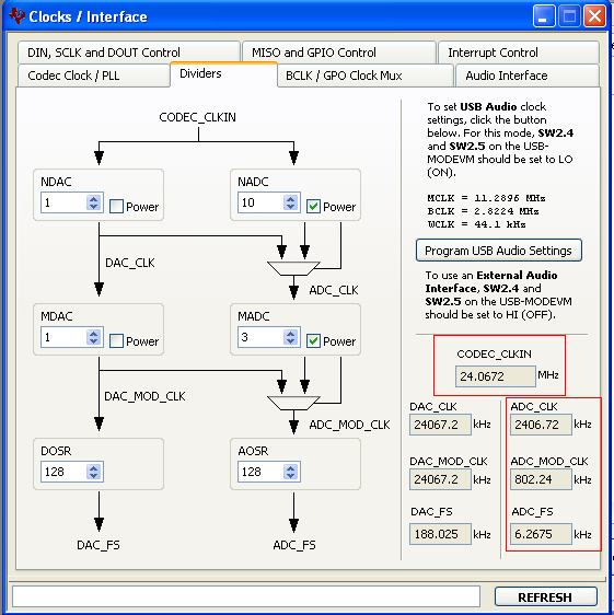 * CODEC_CLKIN = NADC * MADC * AOSR * ADCFS =10*3*128*8000 *