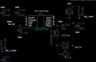 We need to be able to reliably detect presence of a 13kHz rectangular signal in the input, so we decided to try LMC567 part for that. It works but the detector triggers also for near frequencies, we get at least occasional 0 output (meaning the PLL is locked) for the frequence range from 12.1kHz to 13.9kHz.