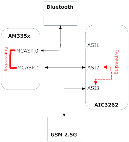 In OMAP part if we need to have voice call from Bluetooth headset in the sense the data path is mentioned in red line GSM_I2S <--> MCASP.2 <--> MCASP.1 <--> BT_I2S in this audio bypassing between MCASP's in done inside the OMAP.