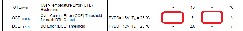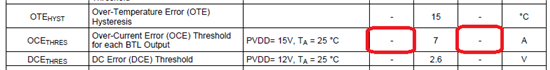 The TAS5760 OCE threshold is ~ 7A+/-1.2A.