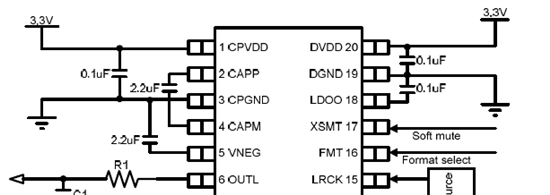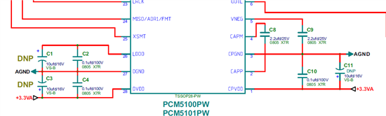 - I have noticed that the schematic of the PCM5102 EVM differs slightly from the recommended schematic on the datasheet. The EVM schematic contains what I believe are decoupling electrolyctic caps and ceramic caps on the power supply, while the datasheet only has ceramics.
