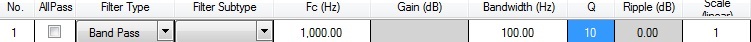 parameters: Fc=f0=1000Hz, Bandwidth=BW=100Hz, Scale=1, Fs=44100Hz