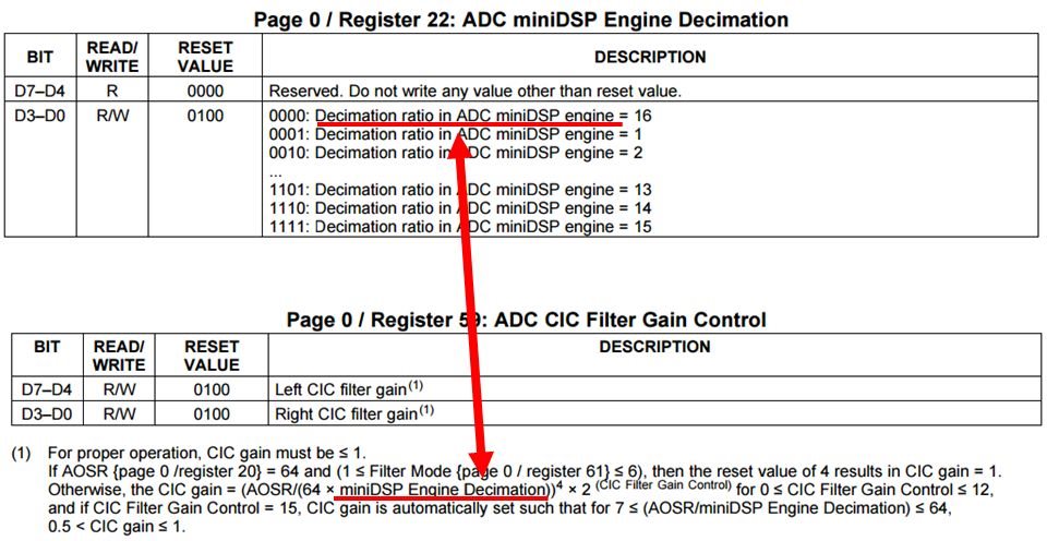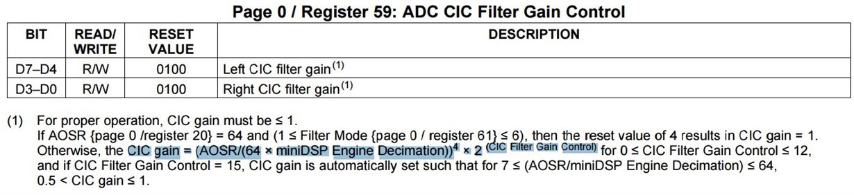 I understand that the CIC gain can be calculated with following formula, so I think "miniDSP Engine Decimation" and "CIC Filter Gain Control" should be set. Please let me know if you need more information to set it.