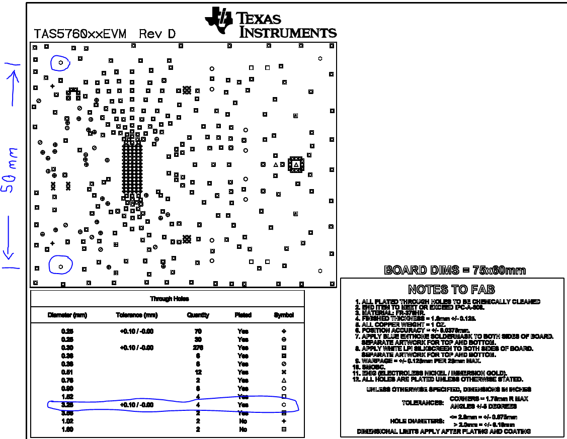 Anyone know where to find the mechanical dimentions on the TAS5760 board? Most important is the 2 screw holes and the big connector.