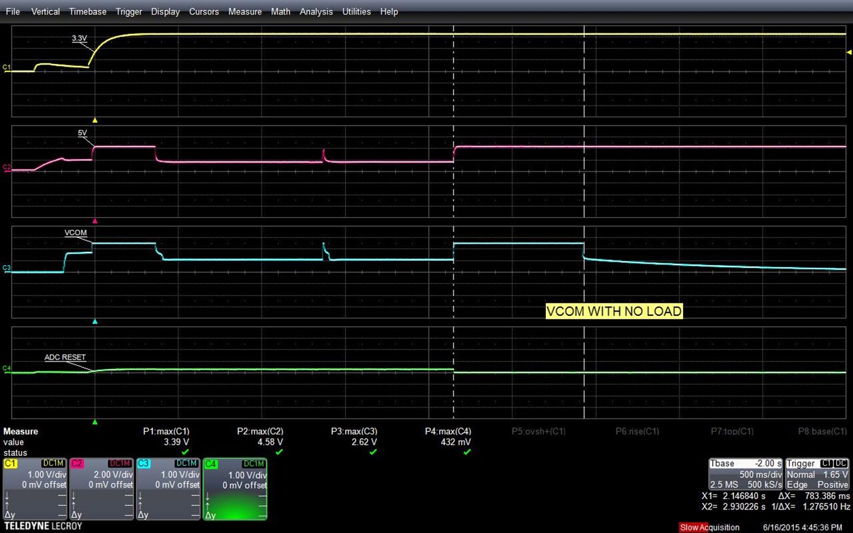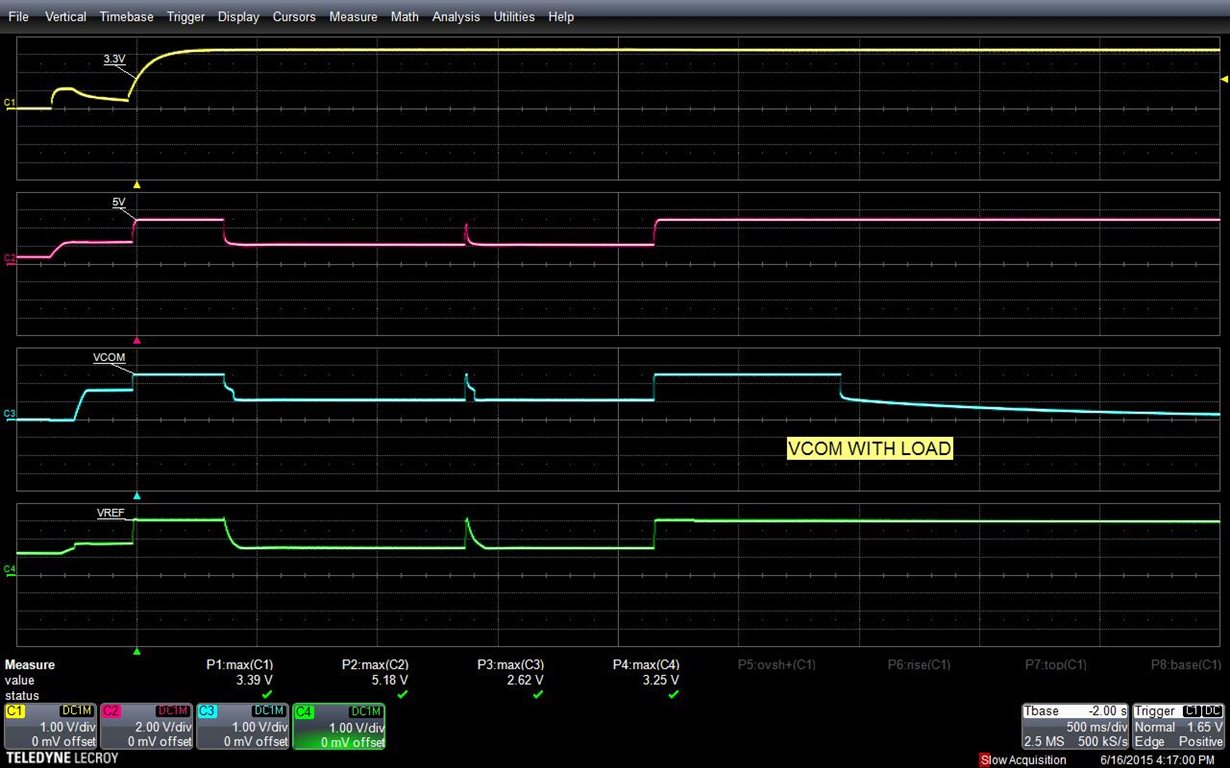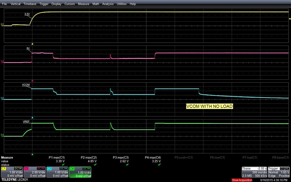 Here is some more screen shots of the problem. VCOM tracks 5V for about 800ms and then drops rapidly to 1V and then slowly decays to 0V.