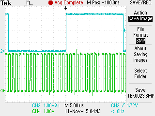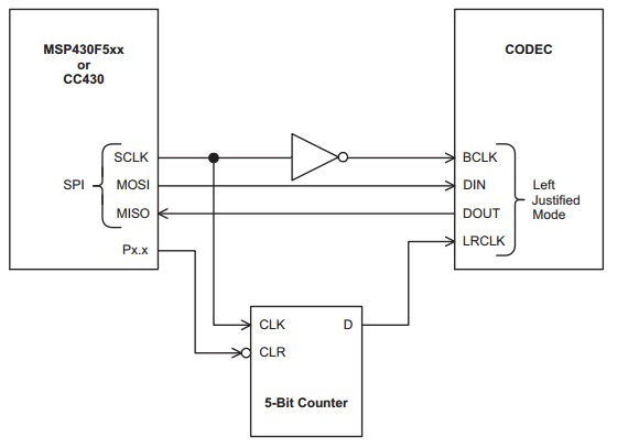 I have previously configured the SPI interface to use a bit rate divider of 0x1F which should yield a real divider of 0x20, or 32. My input clock to the SPI peripheral should be the SMCLK for the micro which is the same clock being fed to the codec's MCLK. This clock should be set at something close to 20Mhz. So, my bit rate on the SPI interface should be 20Mhz / 32 = 625Khz.