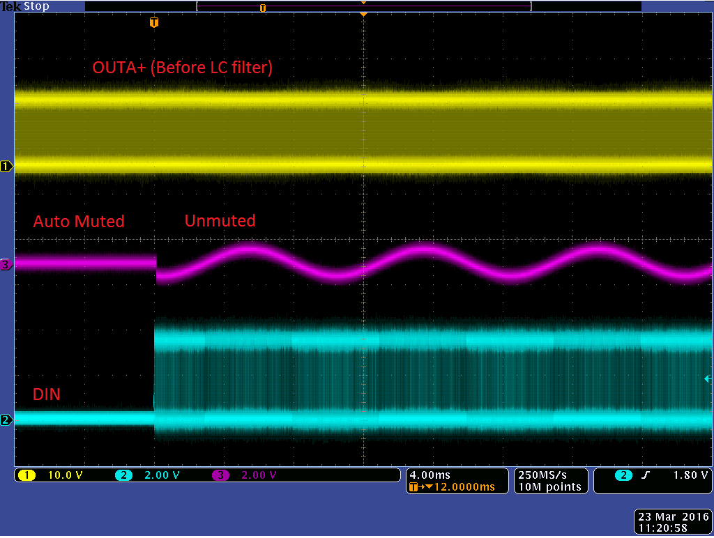 Andy: The transition time you measured for the auto mute when analog mute is disabled should be signal path delay, which is related to FS of the input signal.
