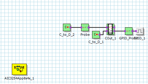 The GPIO is connected to a comparator as shown above. Principally this example works. When changing C_to_D_1 or C_to_D_2, the signal will toggle as expected. At least I can observe it with the Probe Point Tool of PPS.