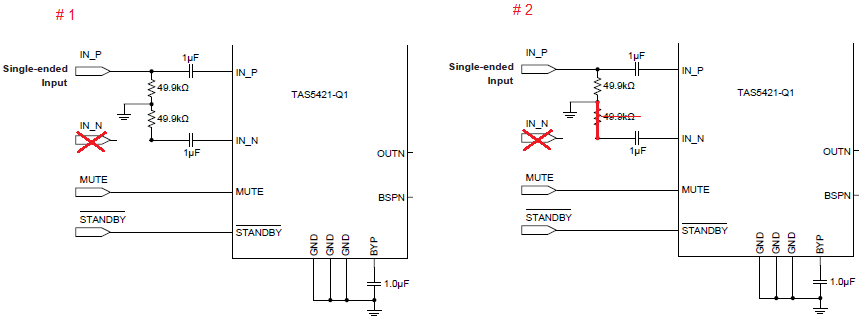 My customer will change the input configuration of TAS5421-Q1 from differential to single-ended, but asked how to handle the 49.9kohm resistors in the typical application schematic of TAS5421-Q1 datasheet when configuring single-ended input. Please comments on this question.