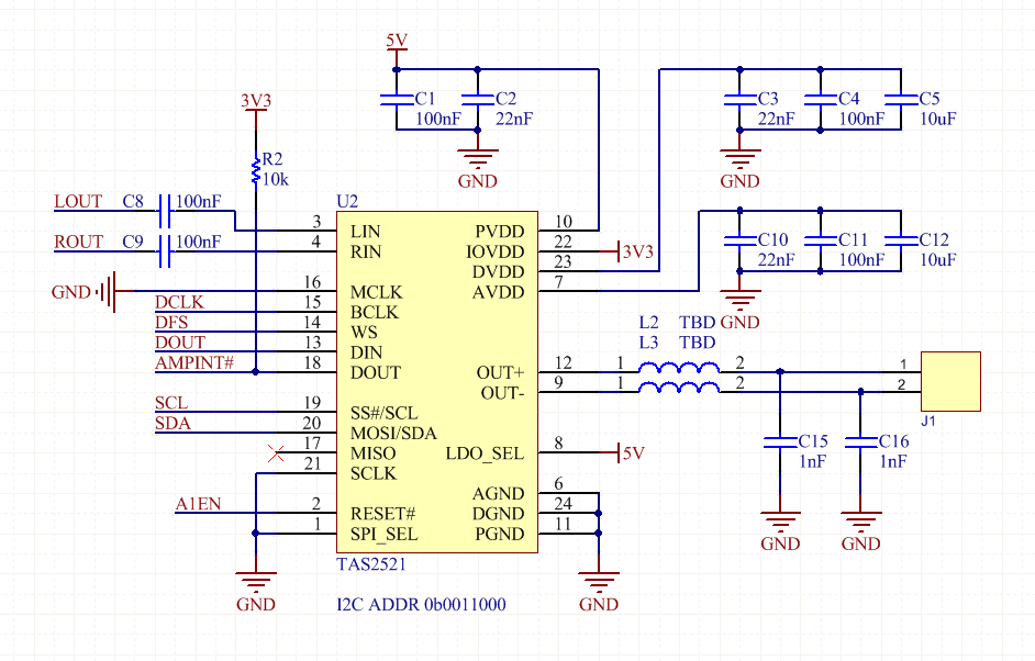 New design, using TAS2521 as both analog and digital amplifier (testing to see which is better for my application. Schematic fragment: