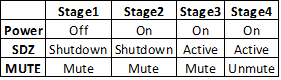 PLease set MUTE pin to High to mute the output when pull up SDZ pin, then set MUTE pin to Low to enable the output after the input common voltage is set up ready.