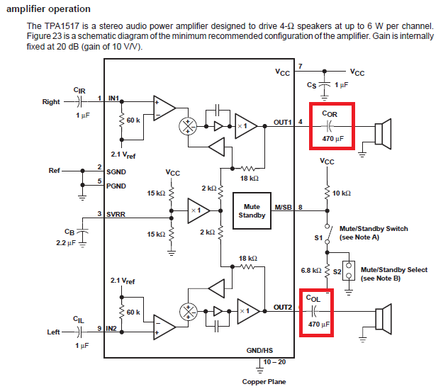 May I know what is the spec for TPA1517 output capacitor (COR)? What is the minimum capacitance and withstand voltage for the capacitor? Is it possible to use capacitor with smaller capacitance and withstand voltage? Thanks.