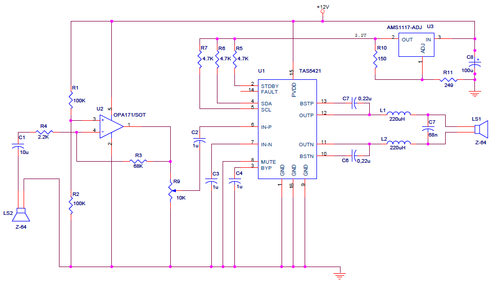 I am trying to drive 64 Ohms impedence speaker using single-ended input. The input source is again 64 Ohms speaker preamplified by ~30dbs using OPA171. The whole system is operating on 12V.