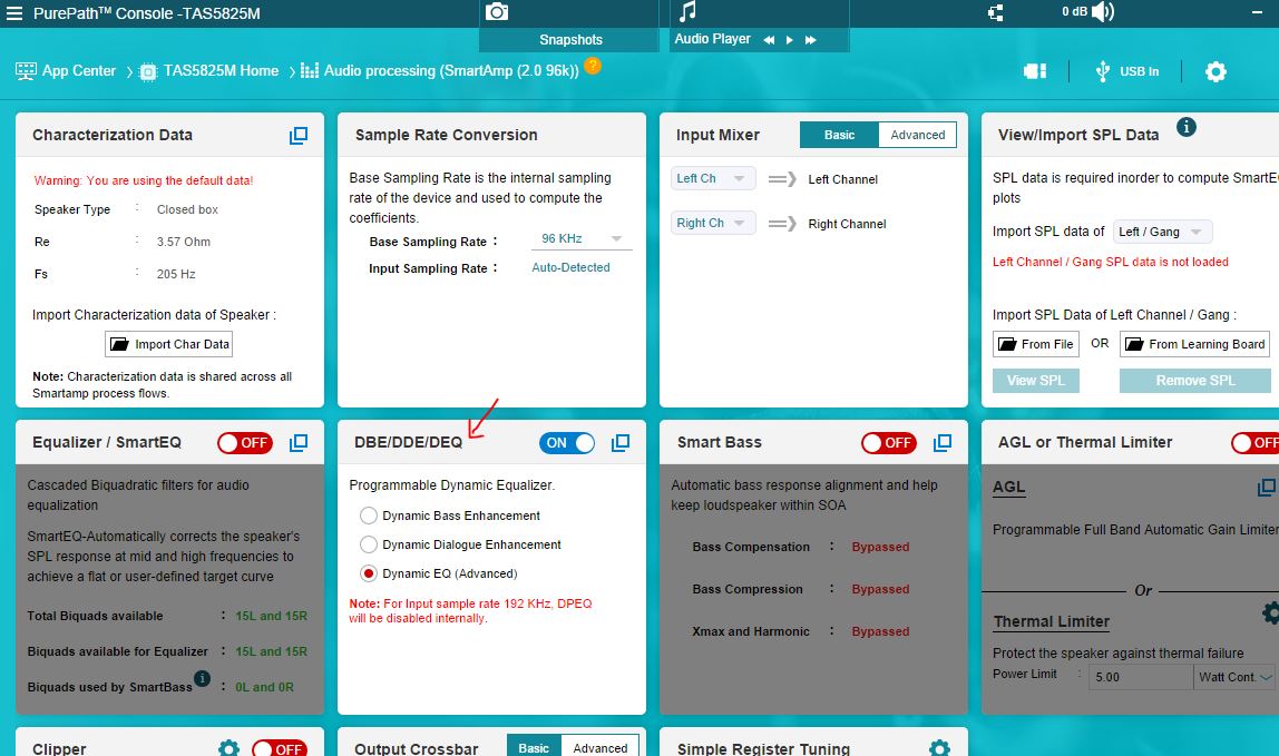 My customer reports the TAS5825 PPC3's DEQ is no function with PPC3 GUI 3.1.7 & 3.1.8 at Smart Amp 96kHz mode. Would you pls assist us to check it up?