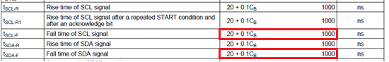 According to datasheet, fall time of SCL/SDA are 20+0.1*CB (ns) to 1000(ns).