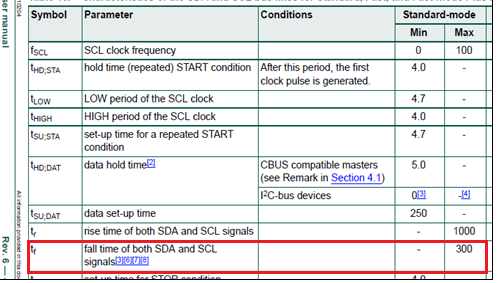 But according to I2C specification(UM10204), it is characterized only maximum 300(ns) at Standard-mode.