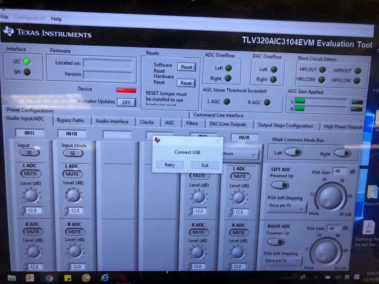 After I setup the GUI and connect the USB cable between PC and EVM, the below information-connect USB still exist the interface, and the D3,D4,D7.D8 is green light, D2 also light, but the color is yellow instead of green, and D5 is red light. Is there any wrong with my setting?