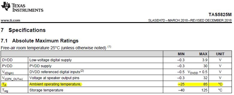 Addition to specification of TA, would you pls provide specification of Tc of the TAS5825 per customer's requests?