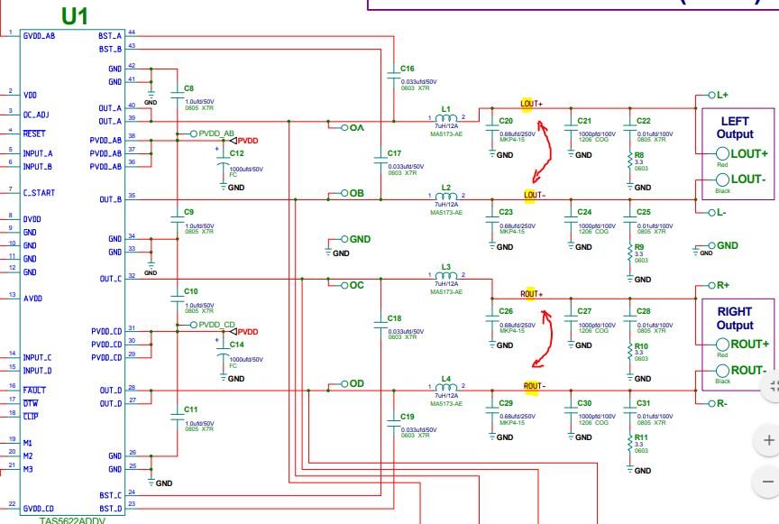 As title, the reference design of the TAS5624A specifies the OUT_A as PWM_L(+), OUT_B as PWM_L(-), OUT_C as PWM_R(+) and OUT_D as PWM_R(-) in BTL mode.