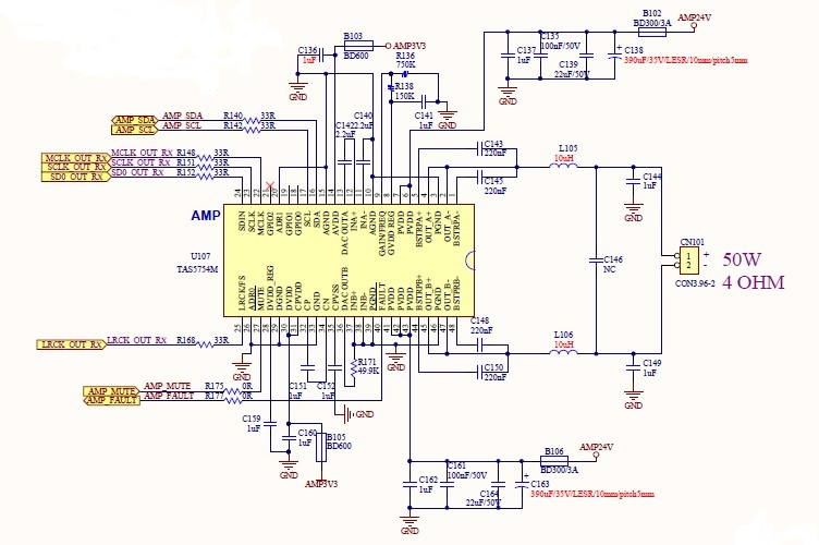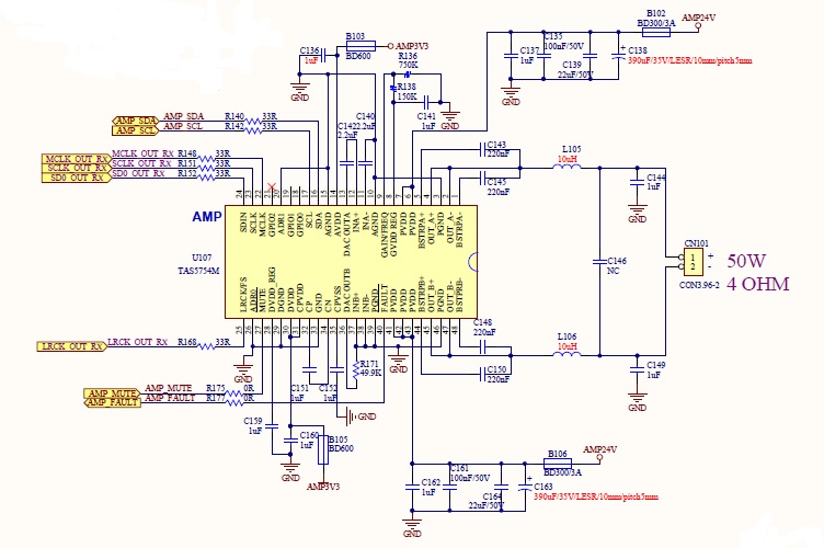 We are using TAS5754M and below is our test result for the frequency response. We observed that the frequency is not flat at low frequency (too high) and begin to drop too fast after 10KHz. Also our schematics attached below, any improve suggestion ?