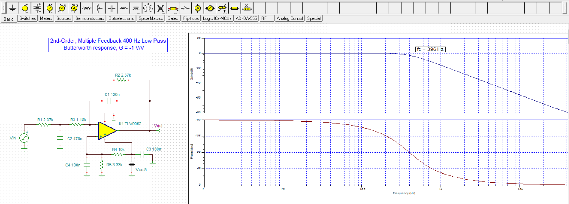 I used a filter design program to synthesize a 2nd-order, 400 Hz low-pass filter having a maximally flat Butterworth response. Once the circuit component values were determined I set the filter circuit up in Tina-TI to check the frequency response. You can see the resulting filter circuit and response obtained from TINA-TI here: