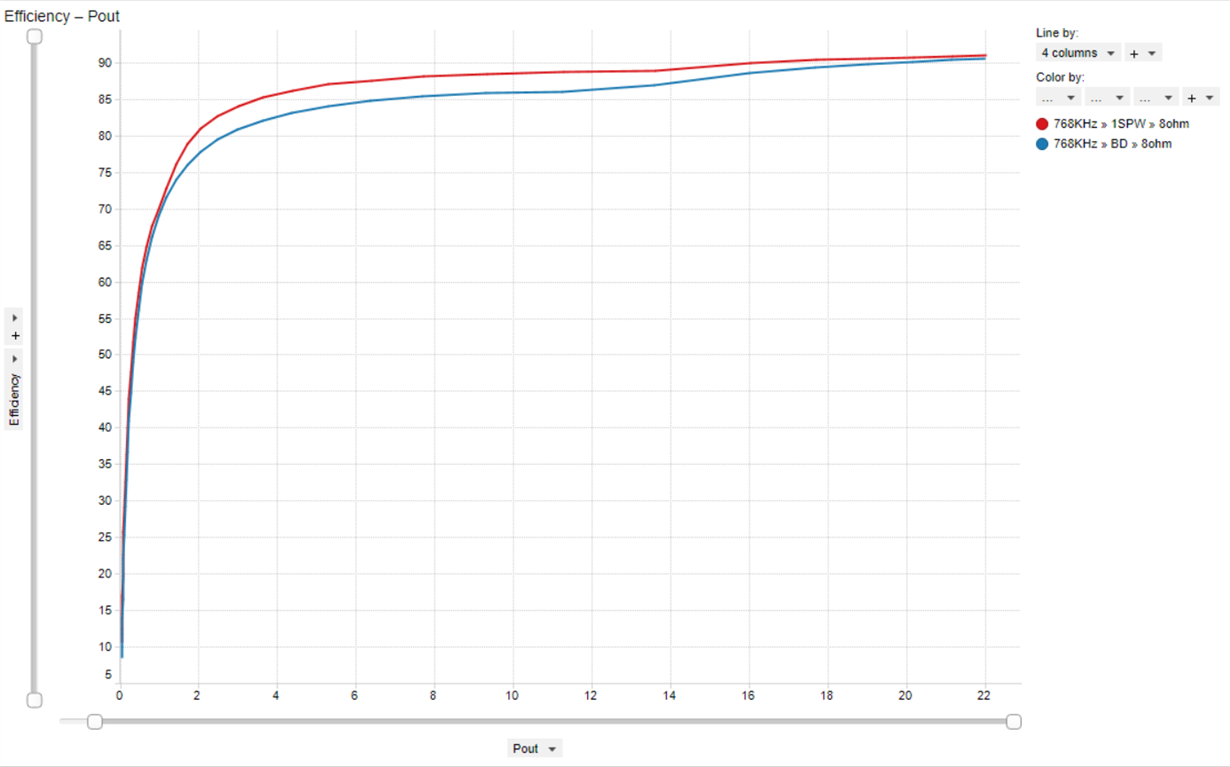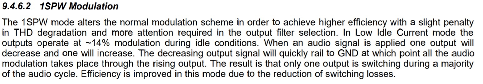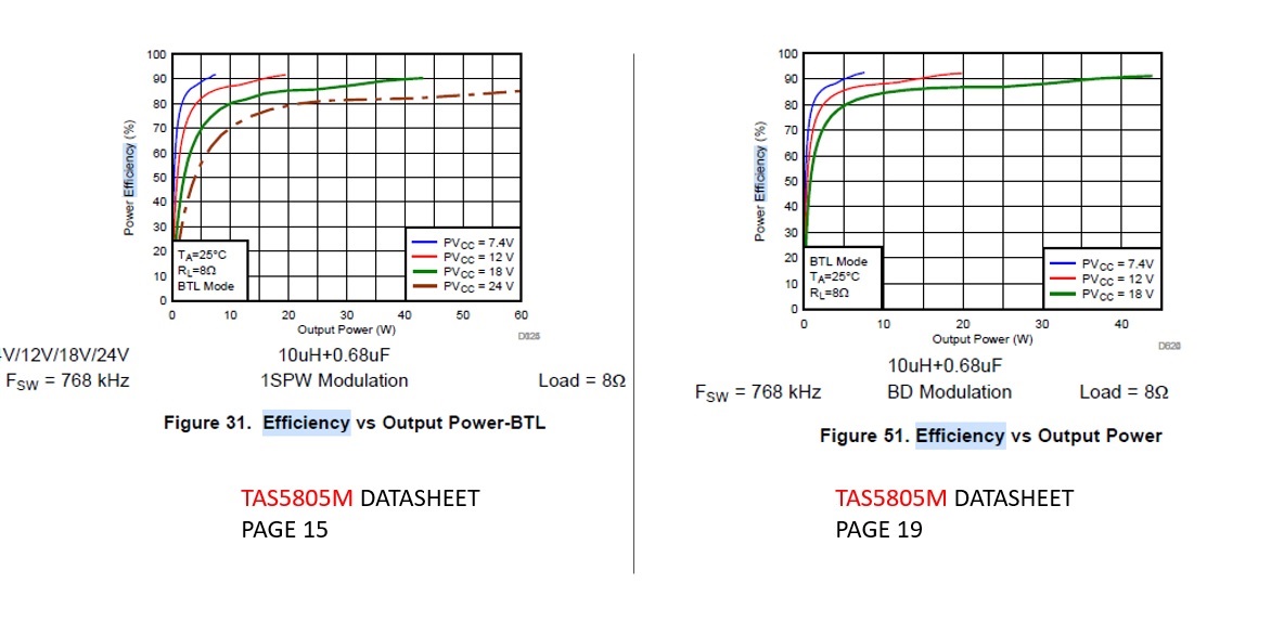 For TAS5805M example, the TAS5805M efficiency table BD modulation and 1SPW modulation.