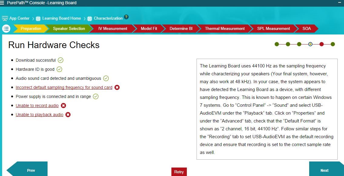I applied a new PP-SALB-EVM but got hardware check failure. Would you please advise how to solve it on Windows 10? I tried to uninstall and reinstall the USB-AudioEVM but it was in vein (it worked with my previous EVM but keeps failure this time).