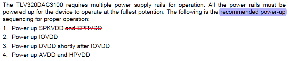 The TLV320DAC3100 is tolerant to power supply sequences. We just recommend this sequence for particular cases where the customers cannot perform the hardware and software reset properly. So, the registers can be fully initialized.