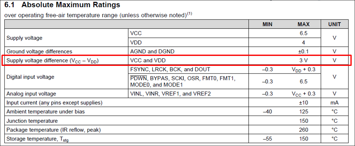 Would you advise my customer's ABS voltage question about supply voltage difference(Vcc-Vdd)?