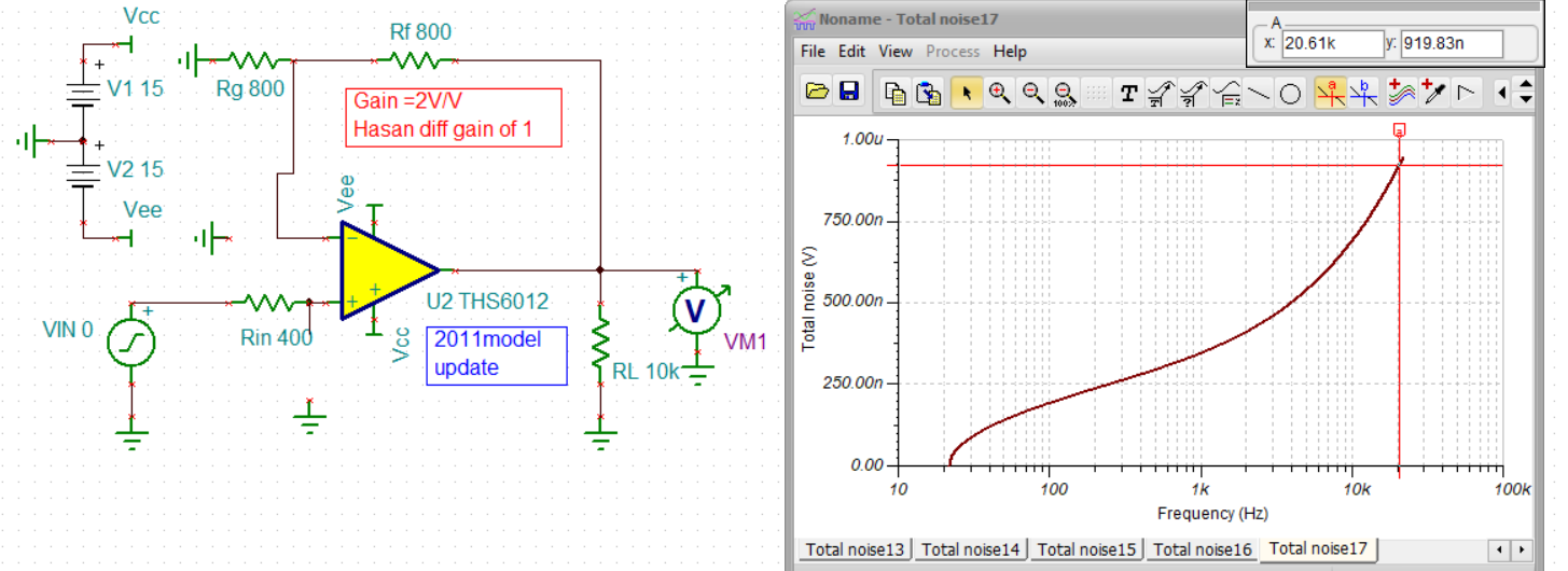 Anyway, working on the noise right now and I am wondering if anyone knows the test conditions for this 0.9uVrms spec line? specifically, the Rf value and frequency span of integration? I am assuming the V+ input has zero source R for this, but if not - what is that value? Originally, I thought the span might be 80kHz given the footnote, but the sims don't seem to support that.