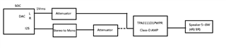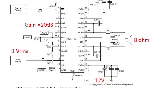 The preliminary setting for TPA3111D1PWPR is below, due to the minimum gain setting is 20dB, so we would need an Attenuator before INP input, then fine tune it to our target power 5~8W, if the INP input is 1Vrms that output will be clipped from comments.