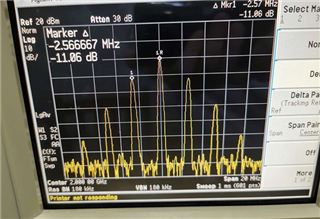 Configure the LMX2594 output 2GHz dot frequency, reference signal 50MHz, phase detector frequency 100MHz, output spectrum as shown in Figure 1, Near the carrier high interference occurs at 2.56 MHz intervals, MUXOUT pin set high.