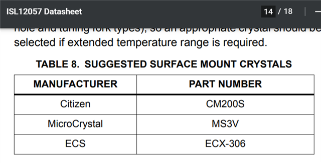 - Whether they need to change crystal part with 12pF load capacitance if use BQ32002DR? The required crystal load capacitance of ISL12057 is 6pF