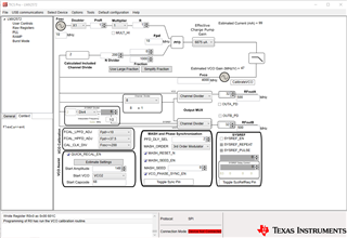 About the system: I have a custom board and a custom program which imports the register file generated by the "TICS Pro" software. After the register map is loaded only the needed registers are modified.