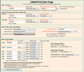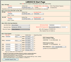 I am using the device for the first time and our application requires an output of 300MHz or 400MHz. Using the TICS Pro software i can re-program from the default 156.25MHz to 100MHz or 200MHz with the default settings in place. When doing so, i change all 8 output channels to the target frequency, Hit the 'Calculate Frequency Plan' and i get what is desired for the 100MHz and 200MHz case. When i try the same methodology for 300MHz and 400MHz, I see 0 for the actual frequency after hitting the 'Calculate Frequency Plan' button. Can someone please explain how to achieve these desired frequencies.