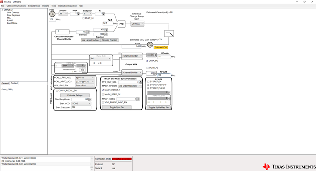 We then read back all register values, which can be found in LMX2572_ReadBackConfiguration.txt, and it seems correct when using the TICS Pro.